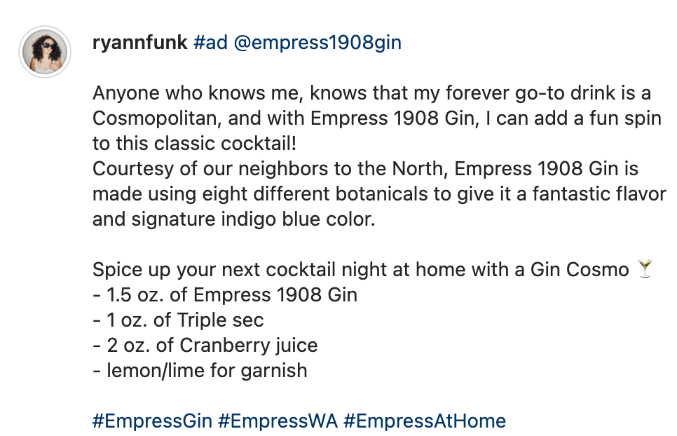 In exchange for an in-feed Instagram post approved by the company, I was compensated with $50 and two free bottles of Empress 1908 Gin.